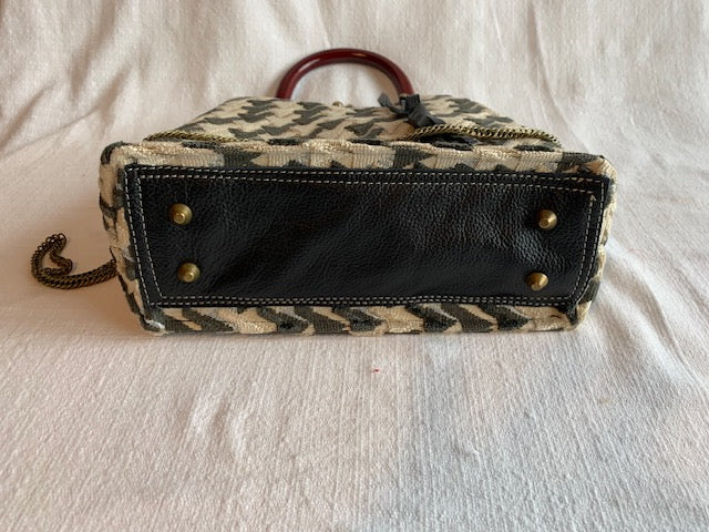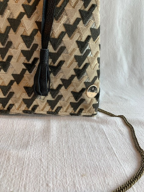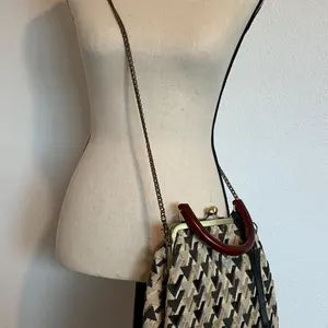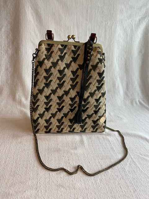 Long style Kiss metal kiss clamp handbag is hand made and one of a kind. Fabric is patterned high/low velvet. Handmade leather tassle with metal accents. Base is black leather with metal feet. All hardware is antique brass and handle is a natural colored wood. Comes with a metal cross body strap/shoulder (48"l). Handmade from upcycled designer fabrics and leathers. This purse is full of style and personality! The antique brass feet on the bottom match the kiss clamp frame. Kiss clamp frame adds security to this bag to protect your items. Interior pockets keep items close at hand. A beautiful floral grey jacquard was used for the lining. Comes with a dust bag in blush cotton for storage. Be bold, be unique, and make a statement with a Ren Handbag!